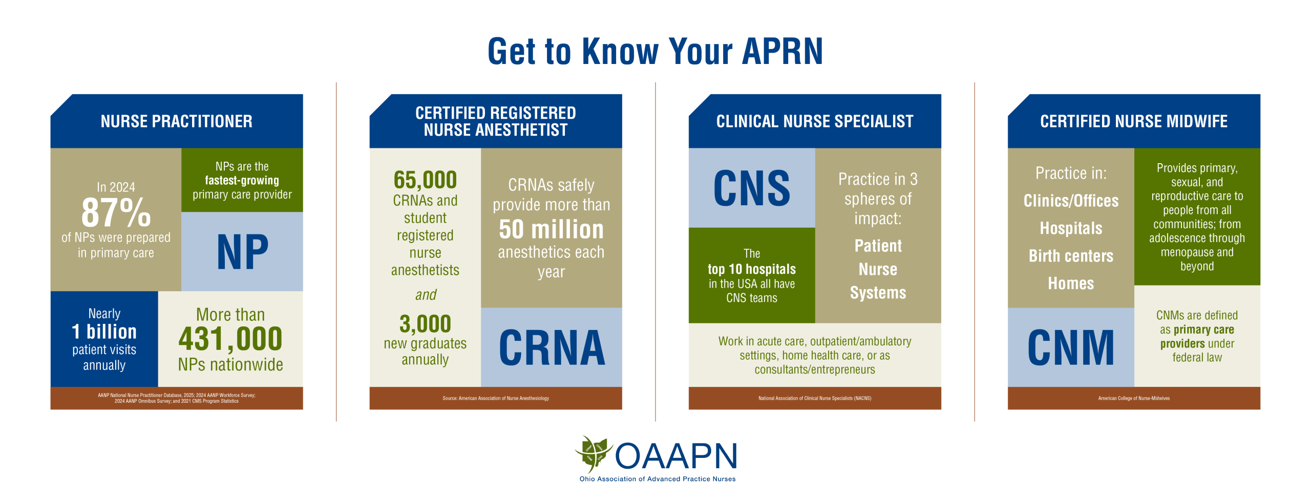Advance Practice Registered Nurses (APRN) include Certified Nurse Midwives (CNM), Certified Nurse Practitioners (CNP), Clinical Nurse Specialists (CNS), and Certified Registered Nurse Anesthetists (CRNA). All of these APRNs practice in Ohio, yet have encountered many barriers to their practice. Undue restrictions often keep APRNs from providing the full scope of services that they are trained to offer.